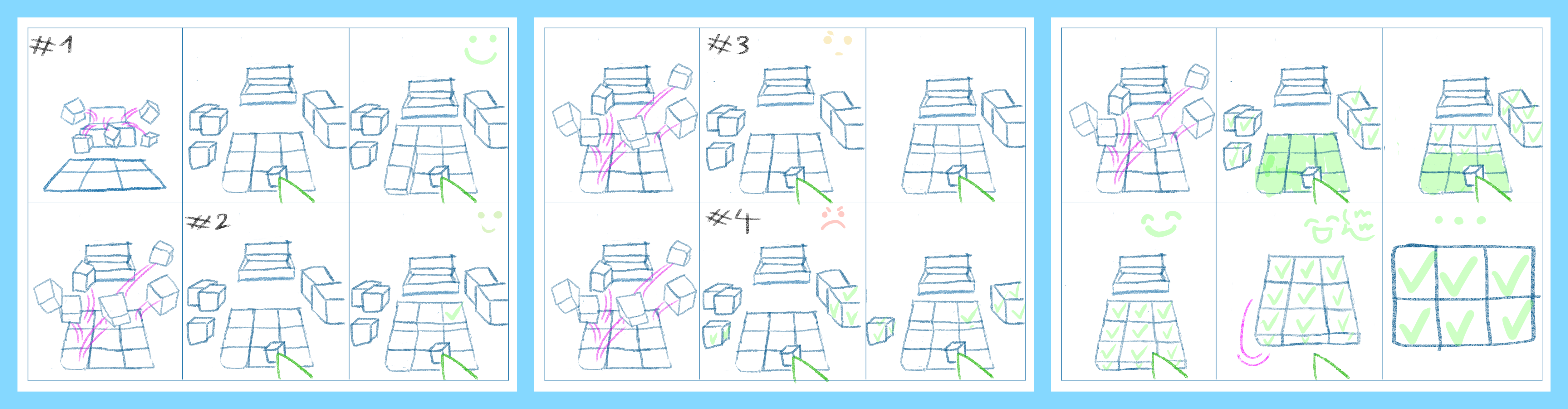 We decided that we wanted to outsource the music and requested the work from an acquaintance, Jeppe Gass. Having to introduce our concept and idea for an uninvolved party required us to refine it. We did this by creating a small storyboard of the interaction flow of the game.